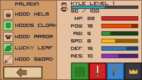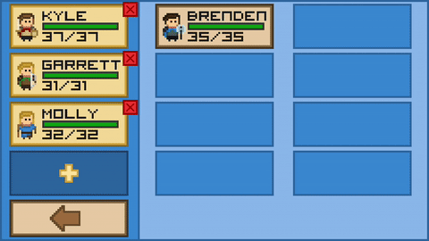 Alright! This past week I have been going at the Menu system pretty hard. To access the Menu you tap on the top left of the screen while playing in the Overworld. This brings up a variety of options: The Party Screen, Item Screen, Beastiary, World Map, and Options. For now I have been really diving into the Party Screen. When you click on the Party icon, you are presented with a stack of the members in your party. On the right side of your screen is a collection of the members of your army. You army will consist of anyone who is not currently in your party. Your party represents the heroes that you take into battle with you, and you can only have 4 heroes in your party at any time. To remove a hero from your party you can tap on the little x near the top right of their little character tile. You can remove as many party members as you like until you only have one hero remaining in your party! This will send unwanted partymembers into your army! Once you have a party with a size less than 4 you can add different heroes from your army into your party! Simply click on the gold plus, and select one of the glowing heroes in your army to add them to your party. If you want to view more details about your heroes, click on their character tile. This will bring you to the Unit Screen.